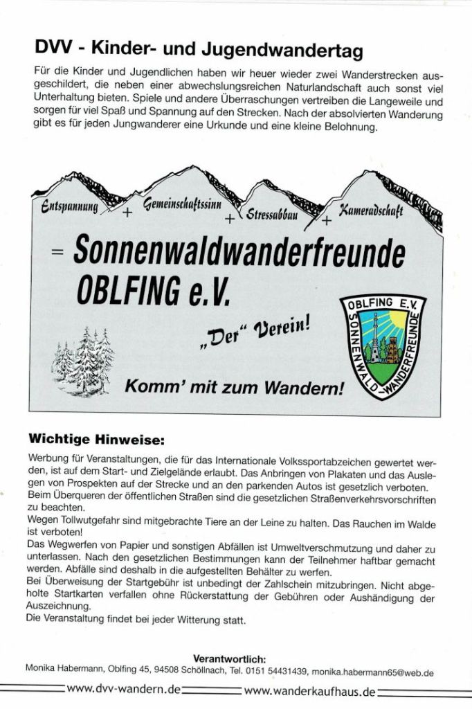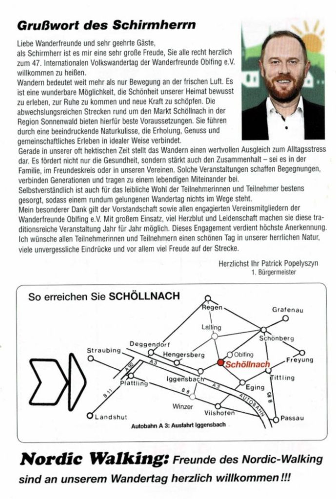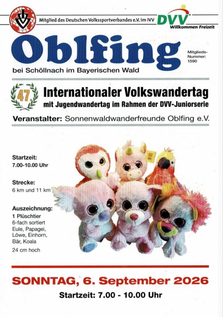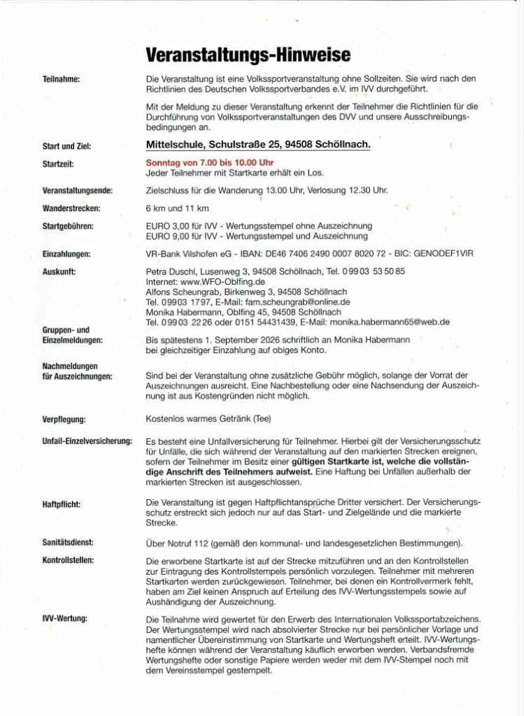 Herzliche Einladung zu unserem Wandertag am 06.09.2026 an alle Freunde, Bekannte, Vereinsmitglieder, Gäste und Schöllnacher! Schaut an unserer Veranstaltung vorbei, es gibt Mittagessen, Brotzeit, Kaffee und Kuchen! Ihr könnt eine kleine Wanderung machen auf einer 6 km oder 11 km Strecke oder auch nur zum Essen kommen!