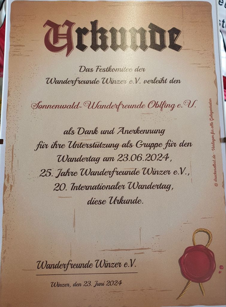 23.06.2024; Heute besuchten wir mit einer Abordnung von 28 Teilnehmern den Wandertag unserer Nachbarn in Winzer. Es war ihr Jubiläum, 25 Jahre Wanderverein und 20. Wandertag. Bei optimalem Wetter, gutem Essen und in geselliger Atmosphäre konnten wir den Vormittag genießen. Danke allen Teilnehmern unseres Vereins!