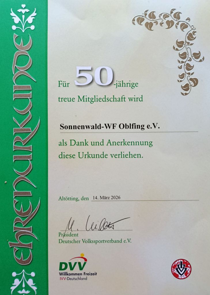 Danach folgten noch Ehrungen: Renate T. erhielt eine Verdienstplakette für 15jährige Schriftführertätigkeiten. Wir erhielten eine Ehrenurkunde für 50jährige Mitgliedschaft im DVV. Des weiteren erhielten noch unsere Mitglieder Petra D., Josef M.,Werner W. und Martin H. Ehrungen vom DVV in Form von Urkunden, Nadeln und Verdienstplaketten. Die Ehrung für Alfons D., der leider nicht mitkommen konnte nahm ich entgegen. Im Anschluß, nach den Ehrungen, verabschiedete sich der Wanderverein Traunreut, vertreten durch Vorstand Heinz E. und Reinhard, zum Jahresende. Dieser Verein löst sich auf. Ich möchte noch Danke sagen bei meinen Begleitern zu dieser Versammlung: Petra D., Martin H., Josef M. und Werner W.